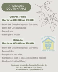Convidamos você e sua família para participar das nossas atividades doutrinárias realizadas semanalmente. São momentos de aprendizado, espiritualidade e acolhimento. Confira os horários e programe-se: