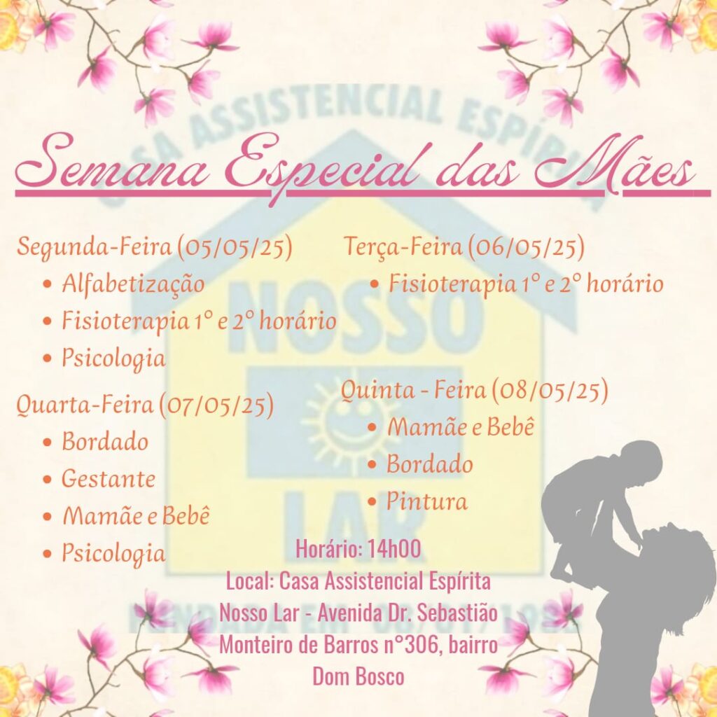 Uma programação cheia de carinho e atividades especiais para celebrar as mães! Confira: 📅 Segunda-feira (05/05/25): Alfabetização Fisioterapia (1º e 2º horário) Psicologia 📅 Terça-feira (06/05/25): Fisioterapia (1º e 2º horário) 📅 Quarta-feira (07/05/25): Bordado Gestante Mamãe e Bebê Psicologia 📅 Quinta-feira (08/05/25): Mamãe e Bebê Bordado Pintura 🕒 Horário: 14h00 📍 Local: Casa Assistencial Espírita Nosso Lar Avenida Dr. Sebastião Monteiro de Barros, nº 306, Bairro Dom Bosco Venha passar momentos incríveis com a gente! 💖