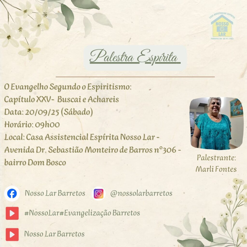 Participe de mais uma oportunidade de aprendizado e reflexão espiritual com o estudo do Capítulo XXV – Buscai e Achareis. 📅 Data: 20/09/25 (Sábado) ⏰ Horário: 09h00 📍 Local: Casa Assistencial Espírita Nosso Lar Avenida Dr. Sebastião Monteiro de Barros, nº 306 – Bairro Dom Bosco 🎤 Palestrante: Marli Fontes 💡 Temas abordados: A importância da fé e da perseverança. Como buscar respostas e soluções espirituais para os desafios da vida. Reflexões sobre os ensinamentos de Jesus à luz do Espiritismo. Venha vivenciar momentos de paz, aprendizado e elevação espiritual. Esperamos por você!
