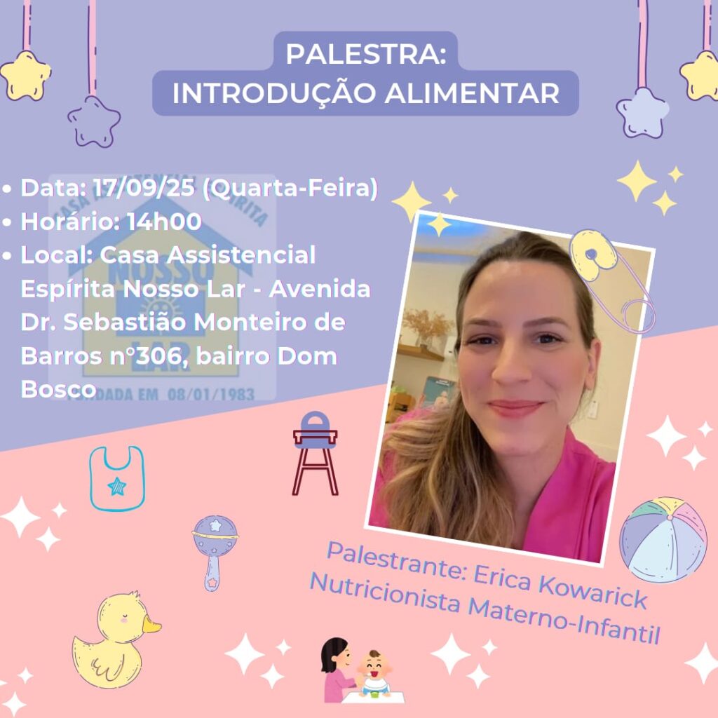 Está chegando a hora de introduzir novos alimentos para o seu bebê? Venha aprender tudo o que precisa para tornar esse momento especial e saudável! 📅 Data: 17/09/25 (Quarta-feira) ⏰ Horário: 14h00 📍 Local: Casa Assistencial Espírita Nosso Lar Avenida Dr. Sebastião Monteiro de Barros, nº 306, Bairro Dom Bosco 🎤 Palestrante: Erica Kowarick – Nutricionista Materno-Infantil 💡 O que você vai aprender? Como iniciar a introdução alimentar de forma segura e nutritiva. Quais alimentos oferecer e como prepará-los. Técnicas para incentivar hábitos alimentares saudáveis desde cedo. Participe e tire todas as suas dúvidas! Esse momento é essencial para o desenvolvimento do seu bebê. ❤️