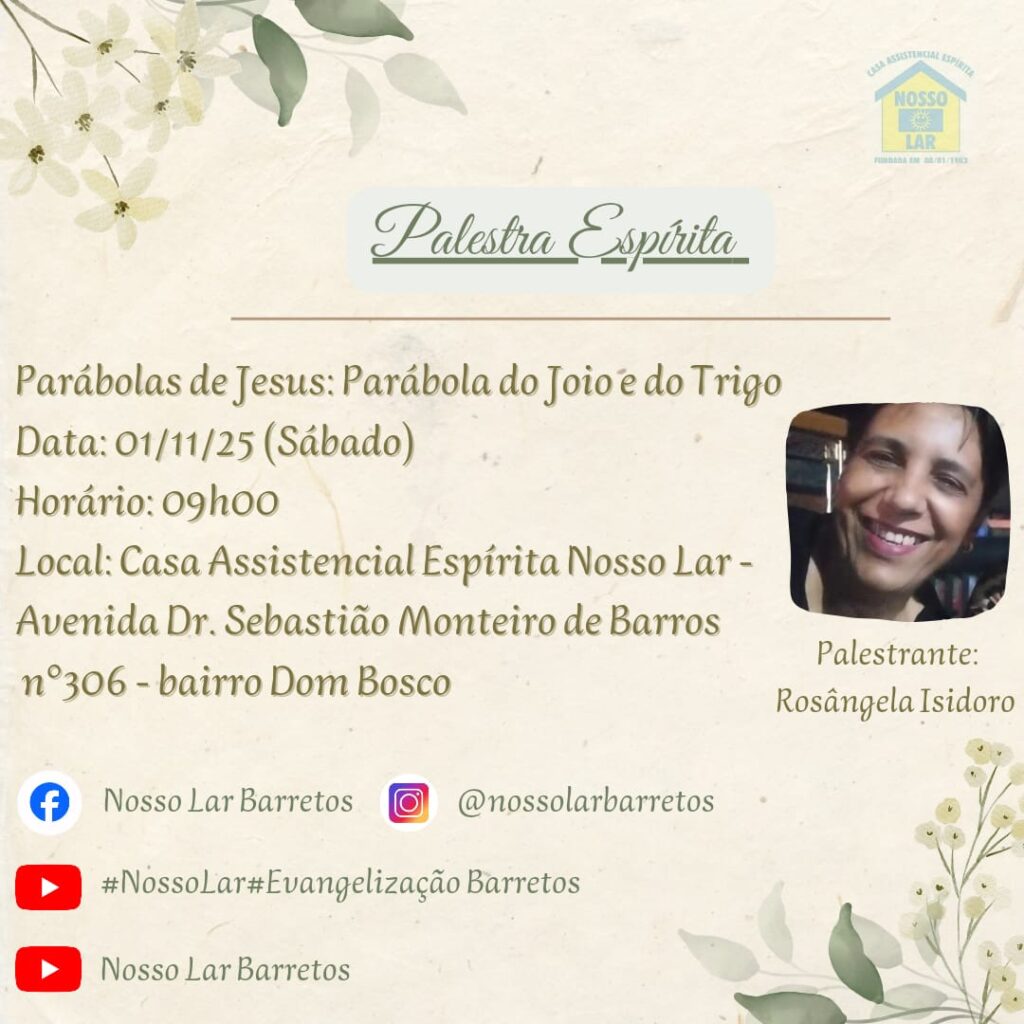 A Casa Assistencial Espírita Nosso Lar convida todos para mais um encontro de aprendizado e luz, refletindo sobre os ensinamentos de Jesus. 📖 Tema: Parábolas de Jesus – Parábola do Joio e do Trigo 🎤 Palestrante: Rosângela Isidoro 📅 Data: 01 de novembro de 2025 (sábado) ⏰ Horário: 09h00 📍 Local: Casa Assistencial Espírita Nosso Lar Av. Dr. Sebastião Monteiro de Barros, nº 306 – Bairro Dom Bosco ✨ Venha participar dessa manhã de paz e reflexão. Traga sua família e amigos para compartilhar conosco esse momento de fé e aprendizado. #PalestraEspírita #ParábolasDeJesus #JoioETrigo #NossoLarBarretos #EvangelizaçãoBarretos #LuzEAlegria