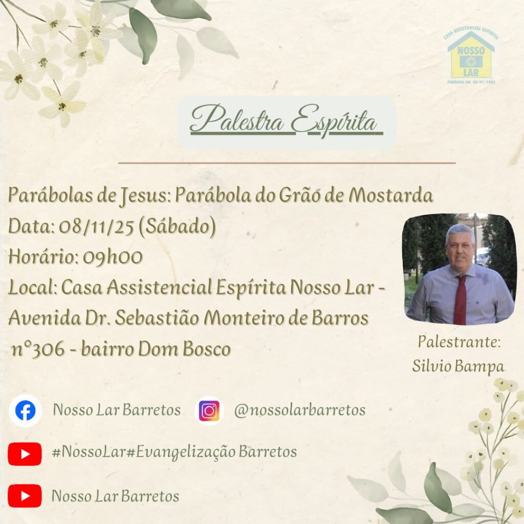 A Casa Assistencial Espírita Nosso Lar convida você para mais um momento de aprendizado e reflexão à luz dos ensinamentos de Jesus. 📖 Tema: Parábolas de Jesus – A Parábola do Grão de Mostarda 🎤 Palestrante: Silvio Bampa 📅 Data: 08 de novembro de 2025 (sábado) ⏰ Horário: 09h00 📍 Local: Casa Assistencial Espírita Nosso Lar Av. Dr. Sebastião Monteiro de Barros, nº 306 – Bairro Dom Bosco ✨ Uma pequena semente pode gerar grandes transformações — venha refletir sobre a fé, o crescimento interior e a força do amor divino. Traga sua família e amigos para esse momento de luz e espiritualidade. 💛 #PalestraEspírita #ParábolasDeJesus #GrãoDeMostarda #NossoLarBarretos #EvangelizaçãoBarretos #FéEEsperança